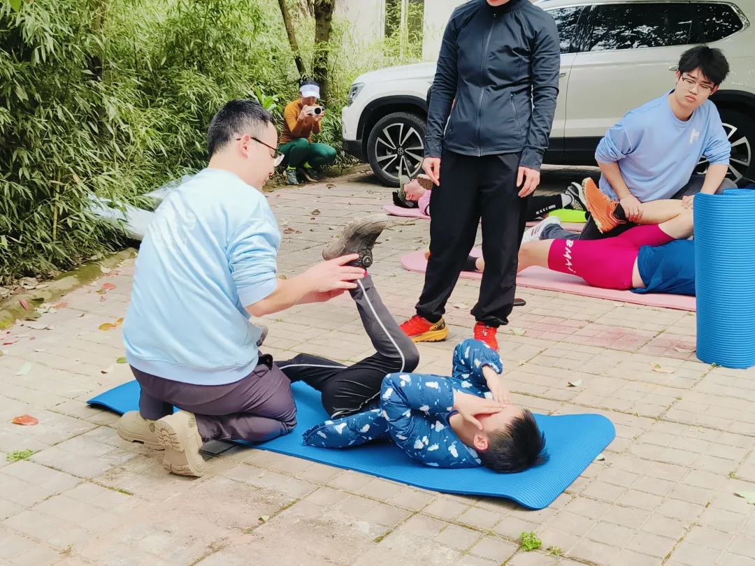 五千米的越野跑完毕,山教练带领校友们进行第一轮肌肉拉伸,帮助血液流向肌肉以促进恢复、防止潜在的运动伤痛。